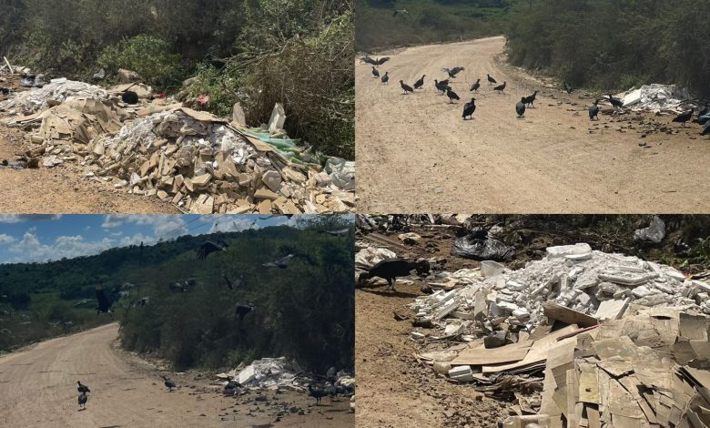 Na manhã desta sexta-feira, 6, por exemplo, havia partes de pisos, gesso, garrafas, ossos de bovinos, restos de cadeiras e cômoda, além de sacos com partes de peixes. Este último atraiu dezenas de urubus que tomaram toda a via.